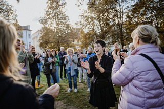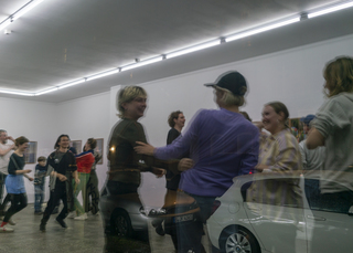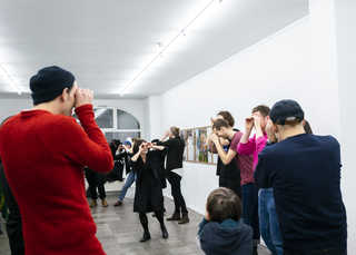 Diese Arbeit setzt sich zusammen aus der gleichnamigen partizipativen Performance Seitenstichkabinett, einer Objektreihe bestehend aus meiner Pappaufstellerin, einem Wasserspender, lächelnden Pappbechern, meinem Zertifikat der Lachyoga-Leiter Ausbildung (gerahmt)